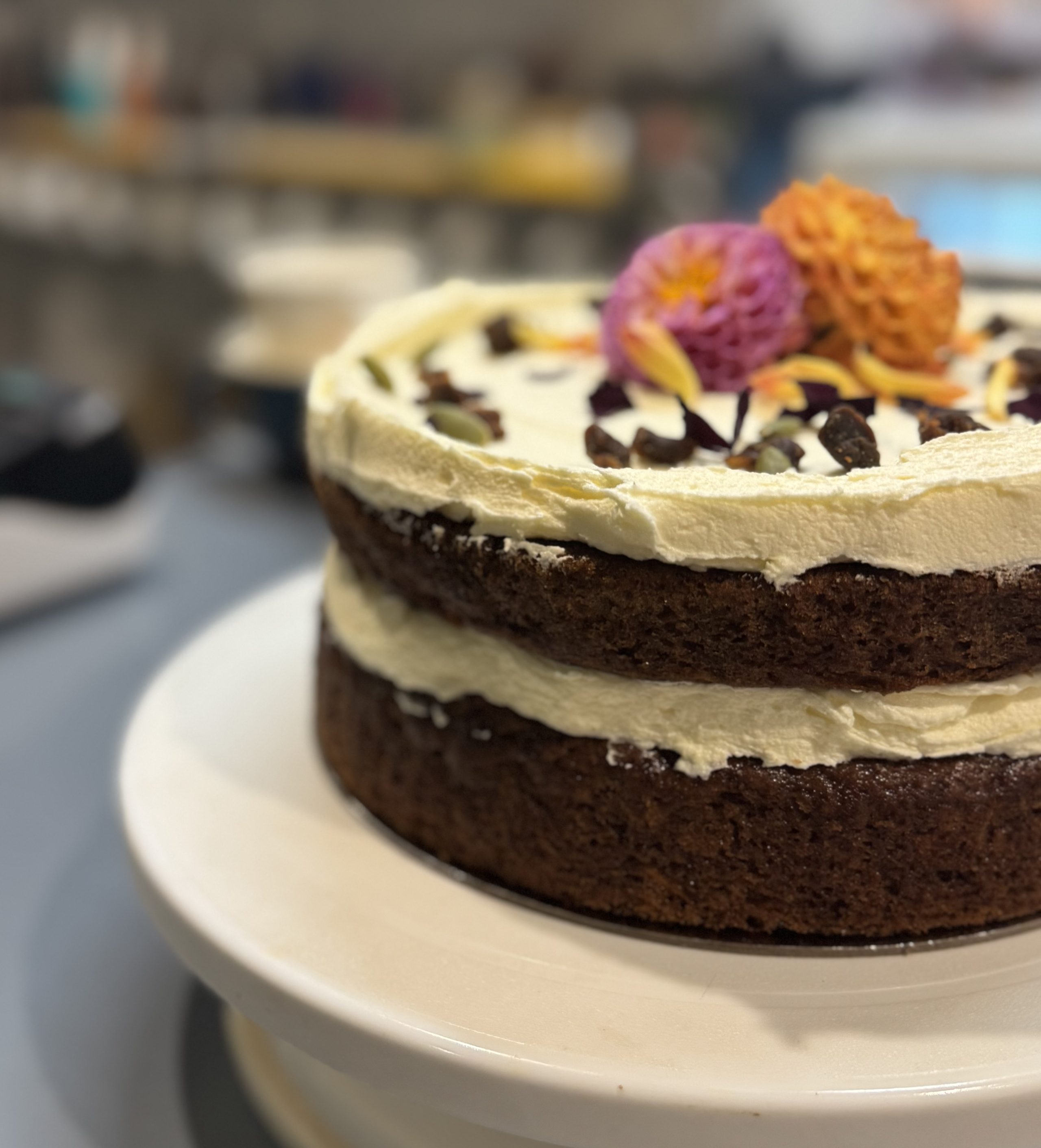 Double layer vegan carrot cake topped with lemon coconutty frosting, roasted walnuts and edible flowers.